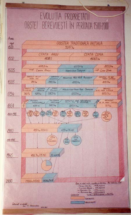 Cresterea exploziva a numarului de membri este trasatura caracteristica a perioadei analizate.Daca, pe total obste, in 1910 erau 342 membri, si in 1945 -381membri, se ajunge in anul 2000 la 834 membri. Dupa cum am mentionat anterior cresterea numarului de membri s-a inregistrat preponderent pe cale succesorala. Alte intrari de membri din afara grupului au fost limitate prin restrictia statutara care interzicea vanzarea de drepturi persoanelor din afara obstei. Este semnificativa evolutia numarului de membri pe apartenenta la grupul localnic si alte localitati.Astfel,berevoestenii aveau in 1910-181 membri Godenii-86 membri (32,1%) iar alte localitati-47 membri(25,6%) .In anul 2ooo,berevoestenii au 442 membri(53,7%),Godenii -268 membri(32,1%) iar celelalte localitati-144 membri (12,2%).Aceste mutatii au generat o evolutie regresiva a suprefetei medii de teren aferente pe fiecare membru al obstei.In 1910 reveneau 5,89 ha per membru, in 1945, 3,67 ha iar in anul 2000 numai 1,76 ha per membru.Diferentierile sunt mult mai mari daca se extinde analiza dupa apartenenta pe localitati. Berevoestenii aveau in 1910 in medie pe membru, 6,62 ha, in 1945- 4,86 ha iar in 2ooo- 1,76 ha. Cei din Godeni, in1910- 4,98 ha, in 1945- 2,74 ha iar in 2000- o,9o ha . Iar cei din alte localitati ,in 1910- 9,19 ha, in 1945- 2,28 ha iar in 2ooo- 1,14 ha.Am insistat asupra acestui aspect intrucat fragmentarea excesiva a proprietatii, la nivelul anului 2000, va crea serioase probleme in administrarea patrimoniului obstei, mai ales in sensul cuantificarii drepturilor cuvenite fiecarui proprietar si partajarii acestora in cadrul aceleiasi partide revenite de la acelasi autor. CONCLUZII *Analiza perioadei 1910-2000 confirma si certifica afirmatiile facute de V.V.Caramelea in lucrarea din 1945.Cel mai alarmant fenomen este regresia suprafetei aferente fiecarui membru al obstei. O eventuala impartire a drepturilor pe fiecare membru, in situatia desfiintarii acestei forme asociative ar fi foarte dificil de realizat. *Studiul a realizat trecerea de la drepturile ipotetice (dramuri) la drepturi reale (unitati de suprafata) pentru fiecare codevalmas, punand bazele unei evidente moderna a drepturilor. *Aspectele structurale, cantitative si calitative, evidentiate consideram ca vor fi utile in administrarea patrimoniului de catre noua forma asociativa care s-a infiintat in anul 2000- Asociatia mosnenilor"OBSTEA STRABUNA-2ooo"Berevoesti. |